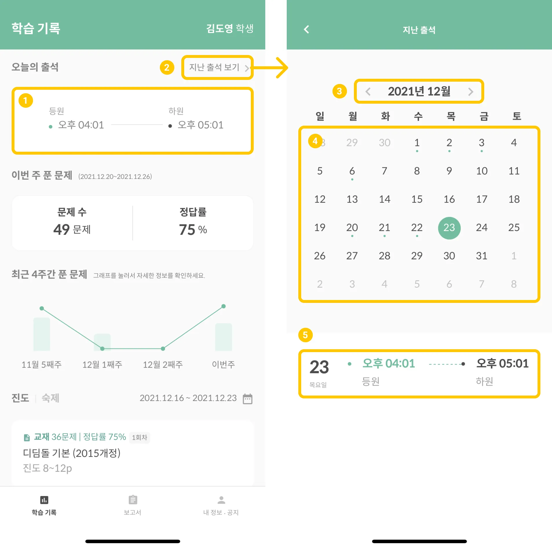 숙제 또는 진도 기록이 있는 날짜는 아래 초록색 점이 표시됩니다.