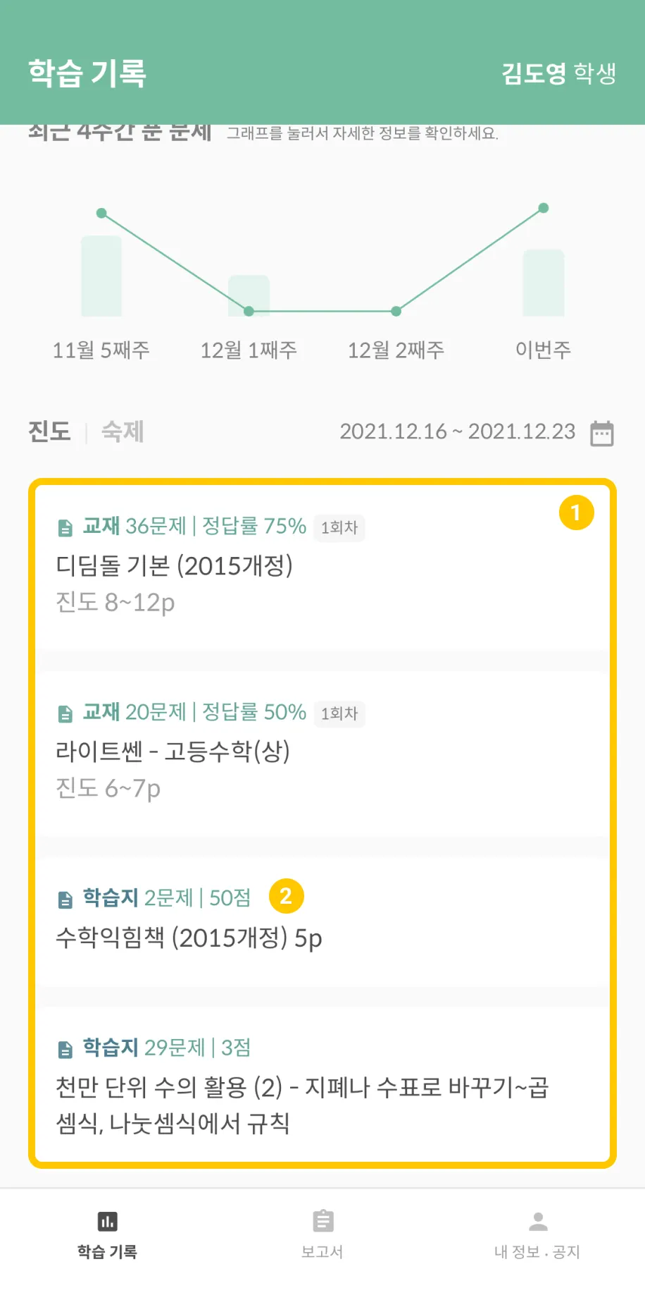 학생이 이번 주 동안 얼마나 많은 문제를 풀었고, 얼마나 많이 맞았는지 알 수 있도록 문제 수와 정답률을 보여줍니다.